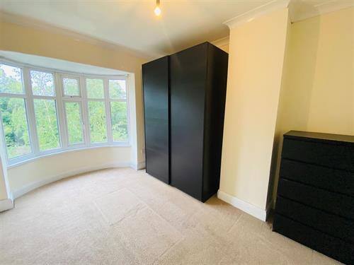 A good sized double bedroom. Bay windowed window with neutral decoration. Beige carpeted flooring. A large free standing, double sliding door wardrobe with integrated drawers. A free standing six drawer wooden unit to match cupboard. Overlooking the well stocked front garden.