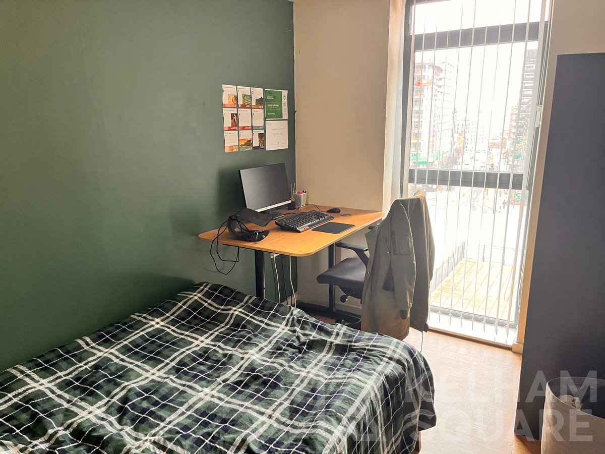 Double-sized bedroom with wooden floors, floor-to-ceiling glazing overlooking West Bar, a freestanding double wardrobe, a computer desk and chair, and a metal-framed double bed with a mattress.
