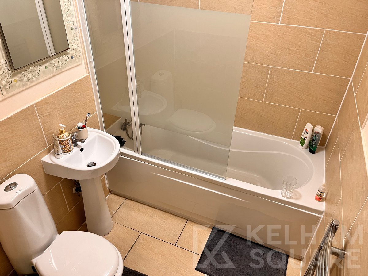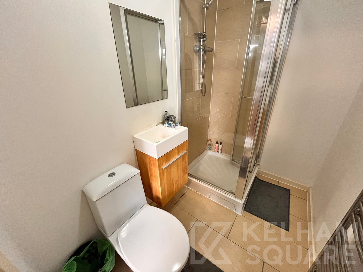 Comprising WC, vanity hand basin with storage, tiled flooring, a wall-mounted chrome towel radiator, and a corner shower cubicle with a glass screen and wall-mounted mixer shower.